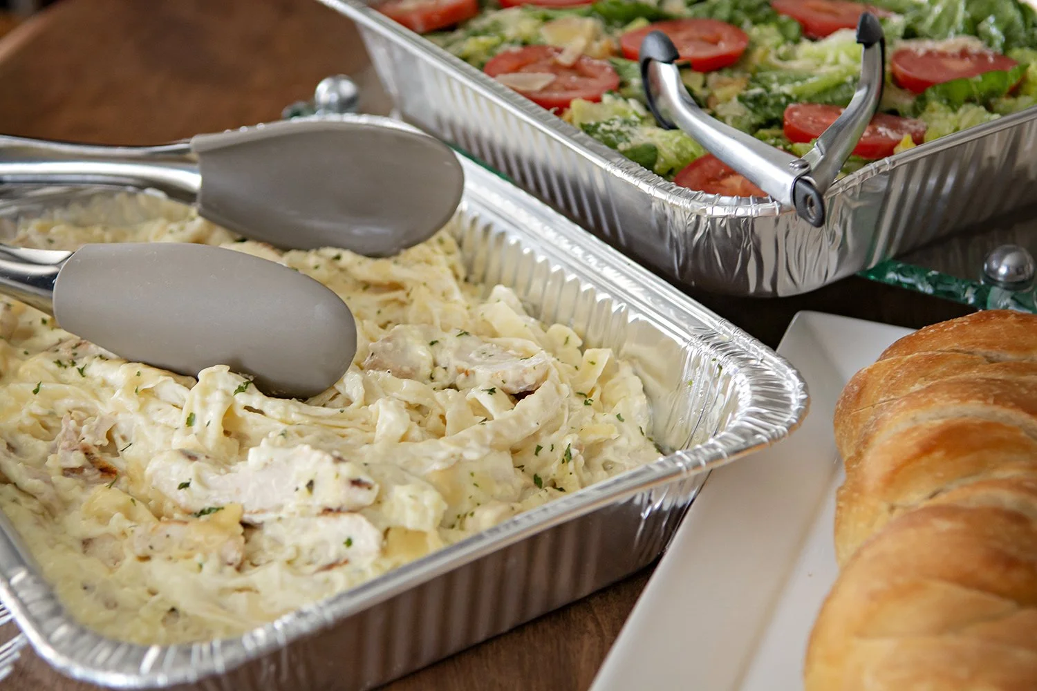 Pan of Penne Alfredo with Chicken and Pan of Salad (Caesar or Mixed Green) with a half loaf of bread